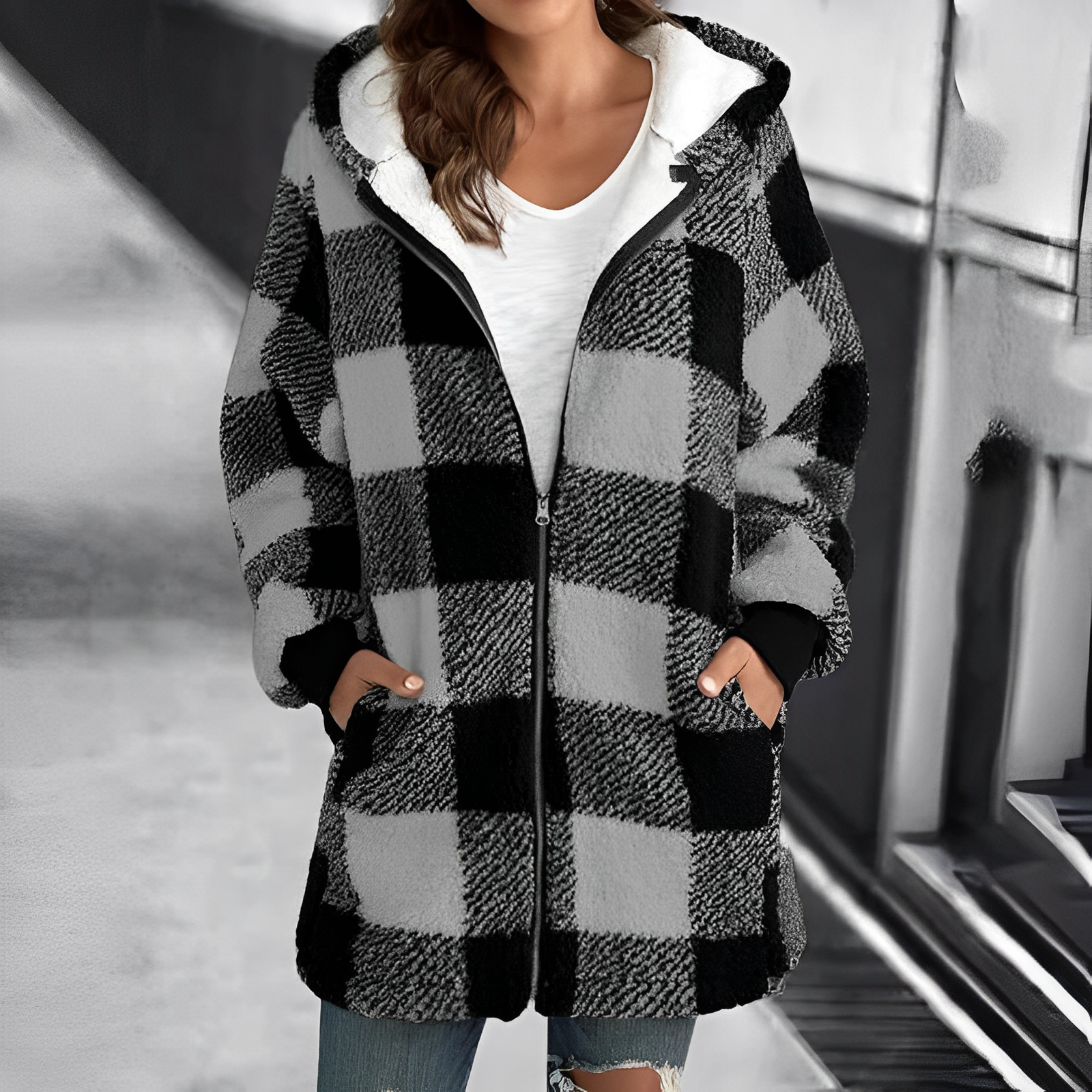Gemütliche karierte Kapuzenjacke mit Reißverschluss für Frauen